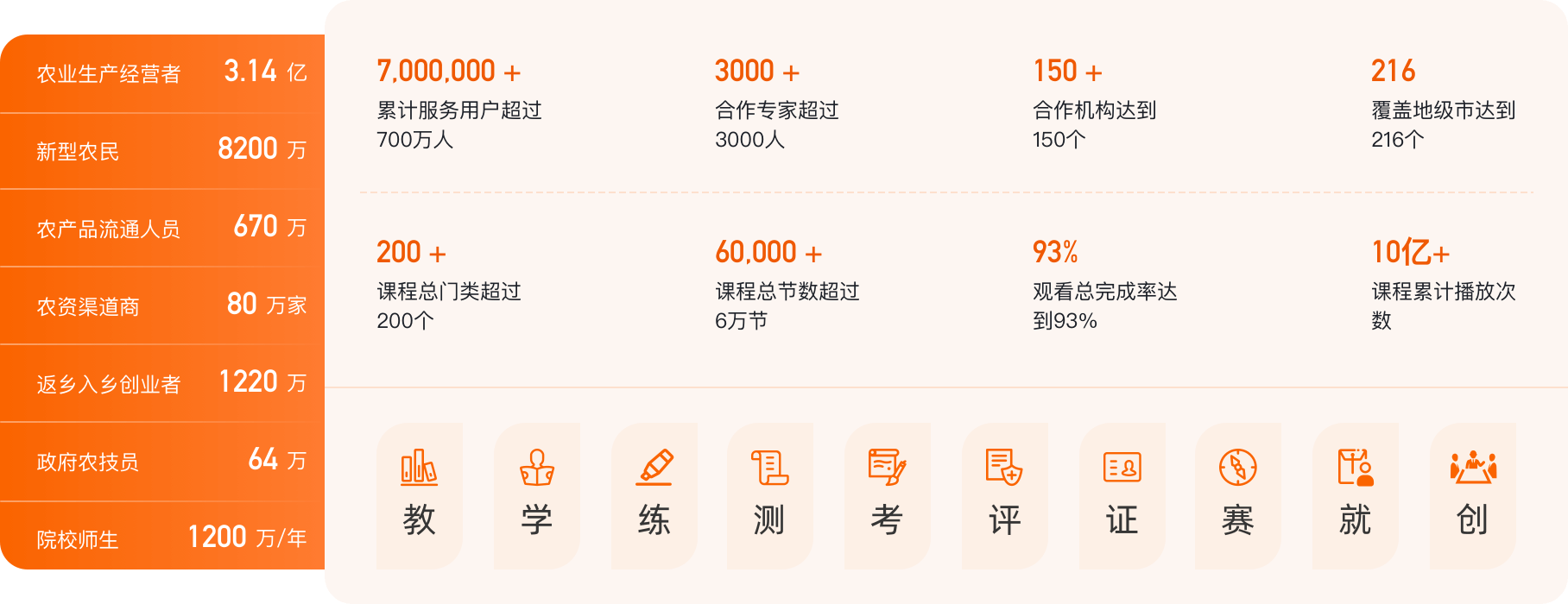 天天学农是国内互联网农民职业教育培训先驱者,目标是培育新型职业农民,助力乡村振兴。目前,天天学农与3000多名农业专家合作,制作超过6万节课程,累计服务用户700万。包括农作物种植、畜牧水产养殖、农业经营管理、花卉园艺等内容,采取课程教学、专家问诊、线上线下培训、公益活动等形式,为广大的农业从业者提供“听得懂、学得会、用得上、信得过”的专业技术课程,帮助他们提升技术,实现增产增收。在院校合作方面,我们深耕新农科建设,发挥职业教育在乡村振兴中的积极作用。